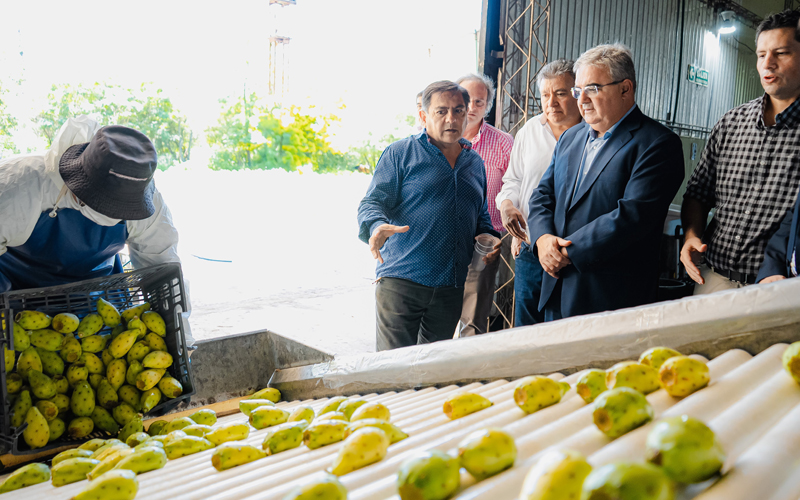 El gobernador Raúl Jalil, junto al vicegobernador Rubén Dusso y el ministro de Desarrollo Productivo, Leonardo Zeballos, visitó el Centro de Educación Agrícola de Nueva Coneta, en la previa del inicio de la primera exportación de producción de tuna con destino a Europa.