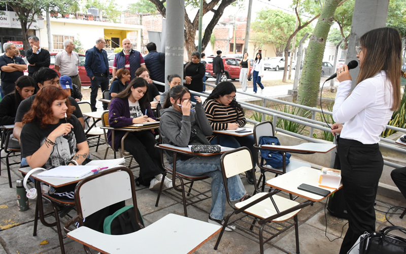 El rector en una clase en la acera de la Facultad de Ciencias Económicas