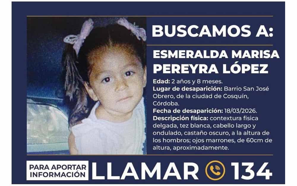 La provincia de Córdoba se encuentra en estado de conmoción tras la desaparición de Esmeralda Pereyra López, una niña de apenas 2 años de edad, vista por última vez el miércoles 18 de marzo. Ante el riesgo inminente, el Ministerio de Seguridad de la Nación activó la Alerta Sofía, un mecanismo de emergencia para coordinar la búsqueda inmediata de menores desaparecidos en situaciones de alto peligro.