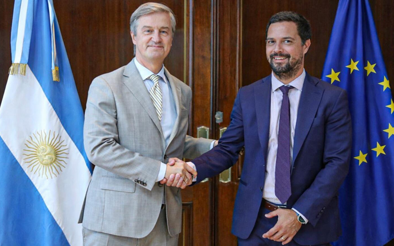 El embajador de la UE en Argentina, Erik Hoeg, y el secretario de Coordinación Productiva, Pablo Lavigne, ya se reunieron con vistas a implementar el Acuerdo firmado el fin de semana en Paraguay. Foto X @erikhoeeg